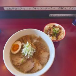 【注文】支那そば(醤油)並(590円)+特製煮豚3枚(180円)。ランチサービスで小ライスがついてきた。キャッチフレーズは「懐かしいけど新しい、シンプルで格好つけない心にしみる味」